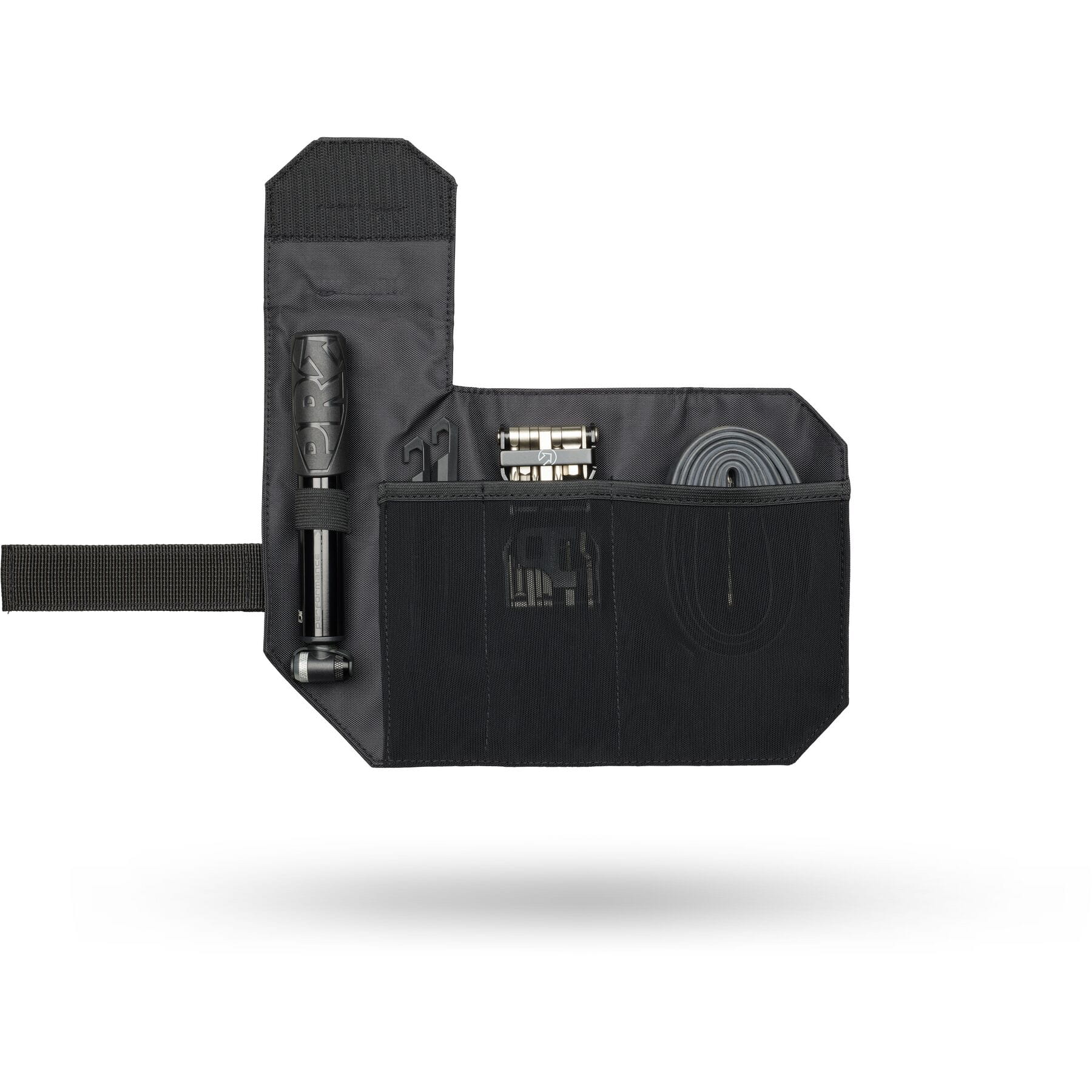 It allows you to store essential tools and accessories like a for mini pump, mini tool, two tyre levers, spare tube and CO2 cartridge with ease. Designed to provide a compact and lightweight storage solution, each item has its own storage pouch within the Tool Wrap Performance Saddle Bag and thanks to its robust 420D Nylon construction and universally compatible Velcro straps it will not only attach to any saddle but also last for years